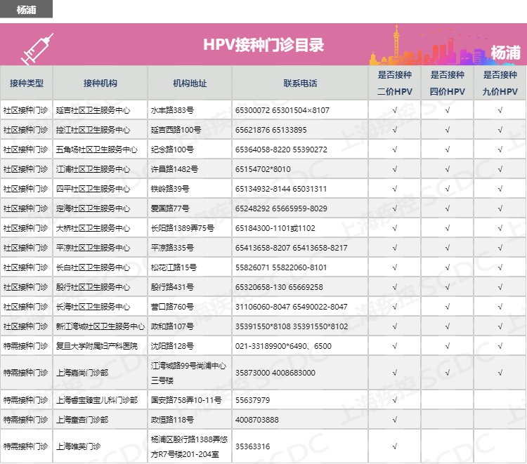 【導(dǎo)讀】:上海市楊浦區(qū)如何預(yù)約HPV二價、四價、九價宮頸癌疫苗?楊浦區(qū)宮頸癌疫苗接種點(diǎn)有哪些?有哪些醫(yī)院門診可以接種HPV疫苗?楊浦區(qū)宮頸癌疫苗預(yù)約電話多少?上海疾控中心公布楊浦區(qū)hpv疫苗預(yù)約接種點(diǎn)地址、電話、服務(wù)時間、網(wǎng)上預(yù)約流程及注意事項(xiàng)。有需要接種hpv疫苗的市民可咨詢了解: |
