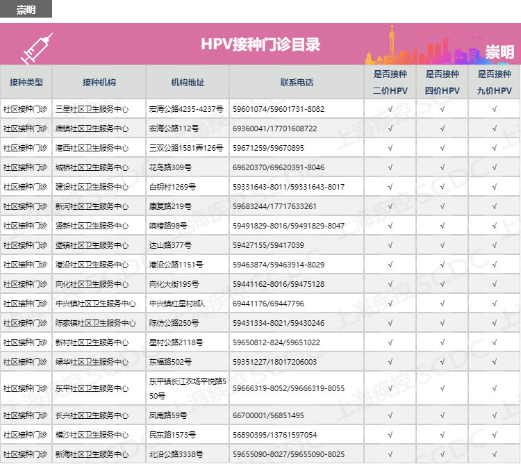 【導(dǎo)讀】:上海市崇明區(qū)如何預(yù)約HPV二價、四價、九價宮頸癌疫苗?崇明區(qū)宮頸癌疫苗接種點有哪些?有哪些醫(yī)院門診可以接種HPV疫苗?崇明區(qū)宮頸癌疫苗預(yù)約電話多少?上海疾控中心公布崇明區(qū)hpv疫苗預(yù)約接種點地址、電話、服務(wù)時間、網(wǎng)上預(yù)約流程及注意事項。有需要接種hpv疫苗的市民可咨詢了解: |
