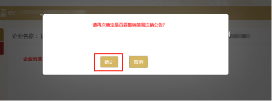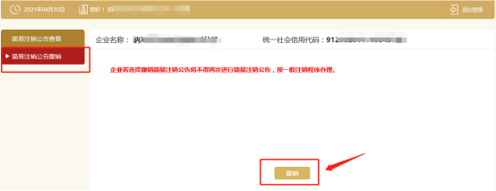 特別提示:自公示系統(tǒng)提交簡(jiǎn)易注銷公告之日起至公告期屆滿后30天內(nèi),企業(yè)可以主動(dòng)撤銷簡(jiǎn)易注銷公告,撤銷后不能再次依程序申請(qǐng)簡(jiǎn)易注銷登記。
