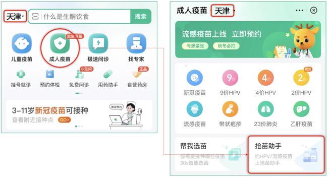 2、選擇“天津”地區(qū),點擊醫(yī)鹿APP首頁“成人疫苗”,進入頁面后再點擊“搶苗助手”