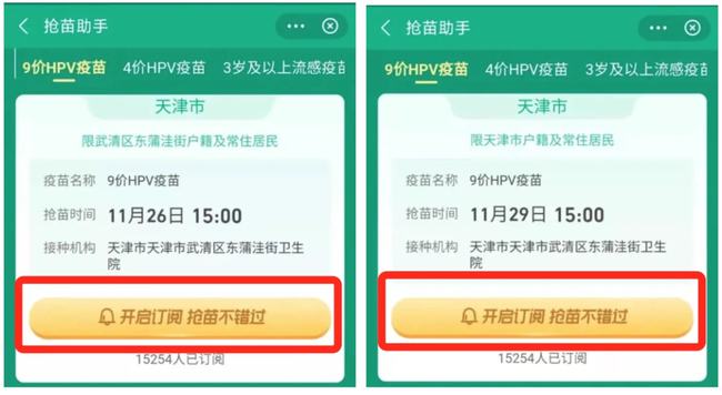 向下滑動,找到天津場次,預(yù)約開放前,點擊“開啟訂閱”即可收到搶苗通知; 疫苗開放預(yù)約時訂閱按鈕將變?yōu)轭A(yù)約入口,點擊立即預(yù)約。
