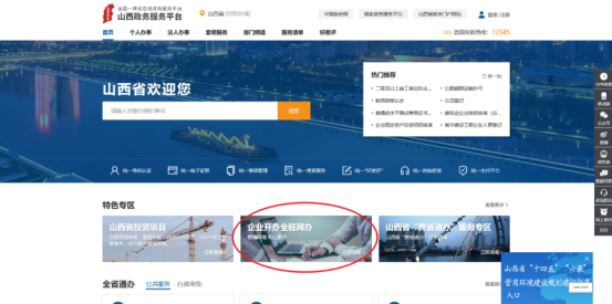 申請人可以通過百度搜索“山西省政務服務平臺”,或者直接在瀏覽器中輸入:http://www.sxzwfw.gov.cn/,進入山西省政務服務網官網以后,選擇“網上登記全程網辦”模塊,訪問網上登記全程網辦系統(tǒng)。如圖3所示: