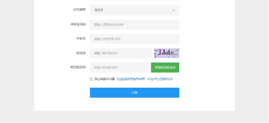 在注冊用戶界面,根據相關內容完成用戶的注冊。需要注意的在注冊用戶時,一個身份證號、一個手機號只能注冊一個用戶,不能重復注冊。