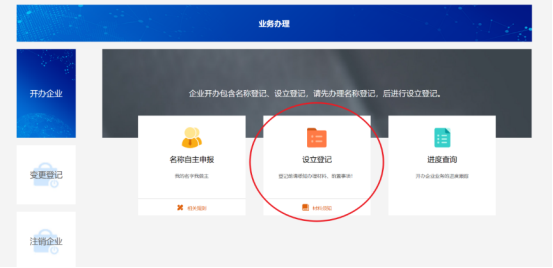 當(dāng)我們在業(yè)務(wù)辦理頁面時,選擇“設(shè)立登記”,如圖所示