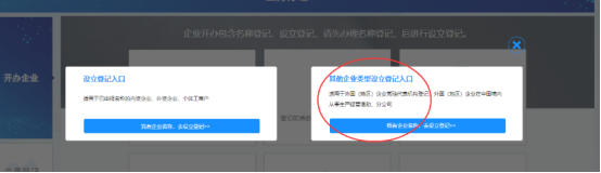 在全程網(wǎng)辦系統(tǒng)中,我們有兩種方式進入我們的設(shè)立登記環(huán)節(jié)。當(dāng)我們在“自主核名”模塊時,我們選擇“設(shè)立登記”,如圖所示: