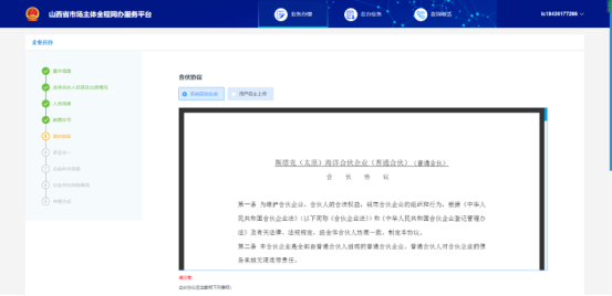 合伙協(xié)議的生成,是根據(jù)在人員登記環(huán)節(jié)是出資金額、承擔(dān)法律責(zé)任有關(guān),在此界面上,我們可以看到系統(tǒng)為我們自動生成的相關(guān)內(nèi)容。