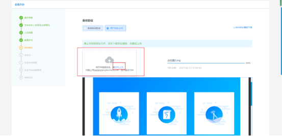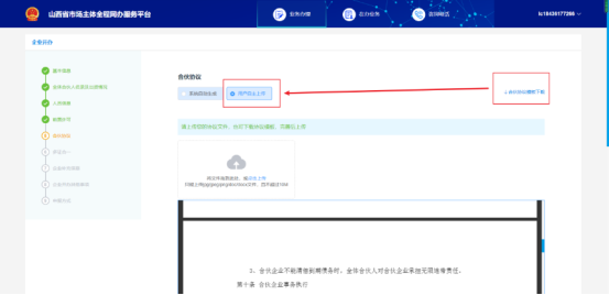 當(dāng)然對于一些企業(yè),不需要通過系統(tǒng)生產(chǎn)的合伙協(xié)議時,我們可以上傳企業(yè)自己的合伙協(xié)議,如圖所示: