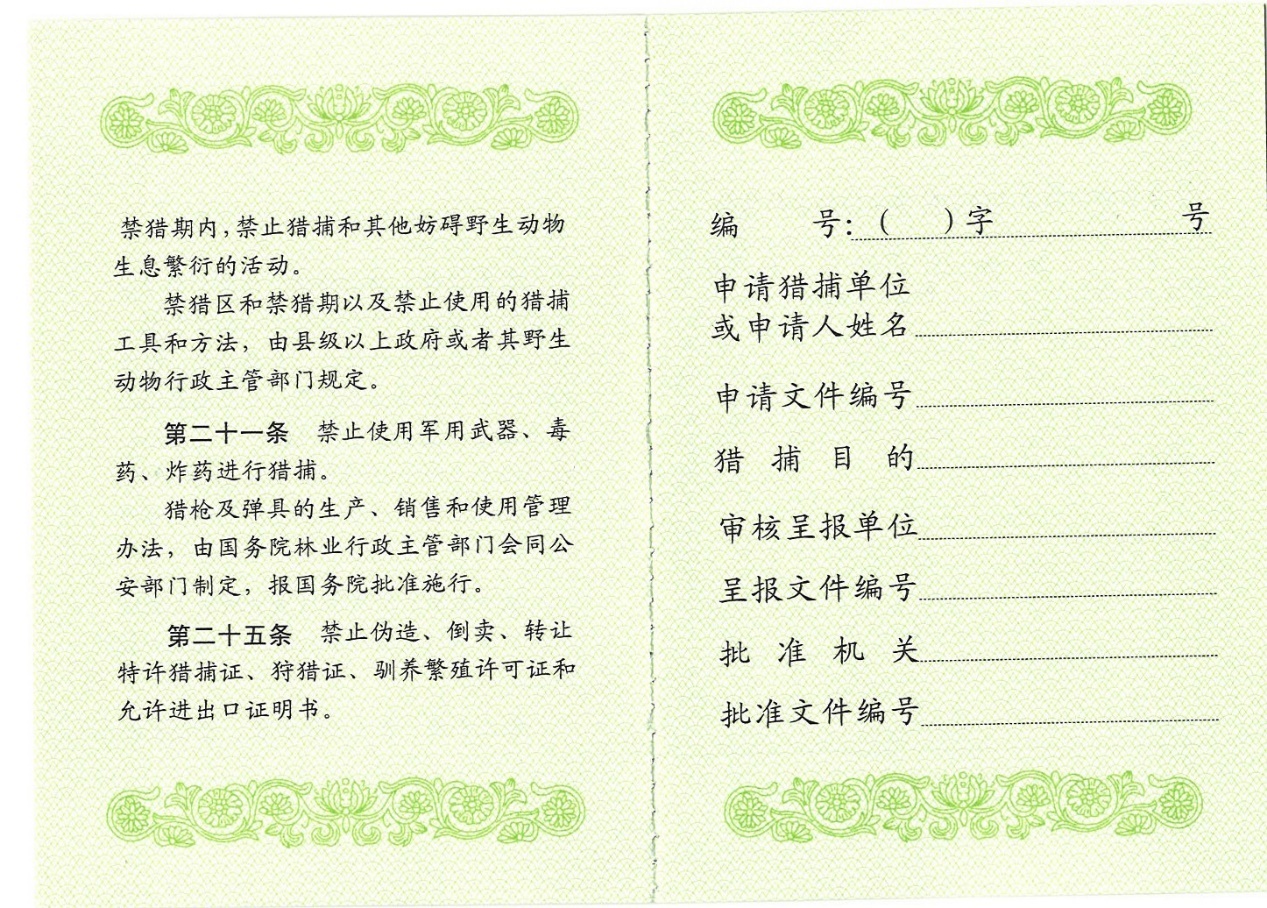 根據(jù)《中華人民共和國(guó)野生動(dòng)物保護(hù)法》第十六條、《中華人民共和國(guó)陸生野生動(dòng)物保護(hù)實(shí)施條例》第十二條和《林業(yè)部關(guān)于實(shí)行<特許獵捕證>有關(guān)問(wèn)題的通知》的規(guī)定,對(duì)材料進(jìn)行實(shí)質(zhì)性審查,作出許可決定。