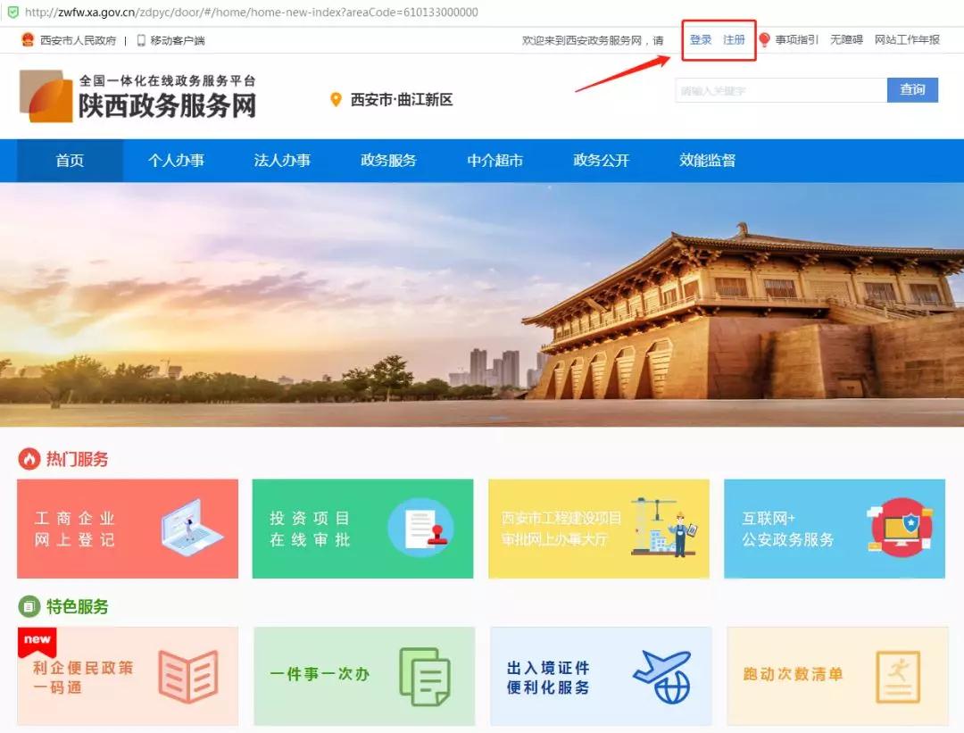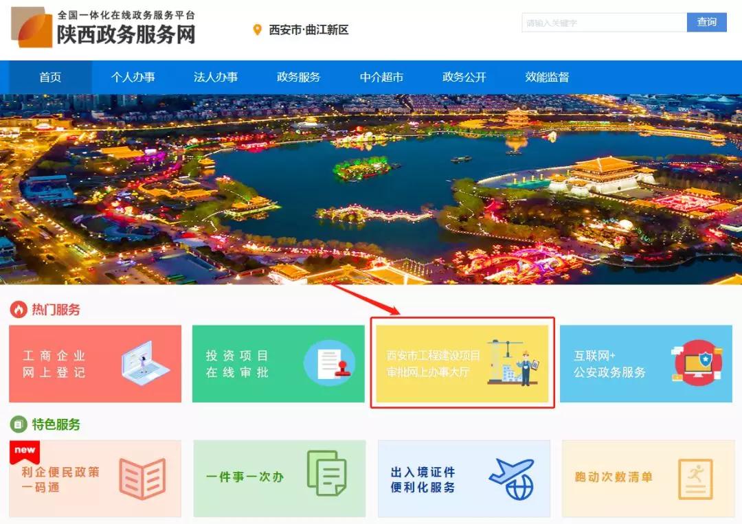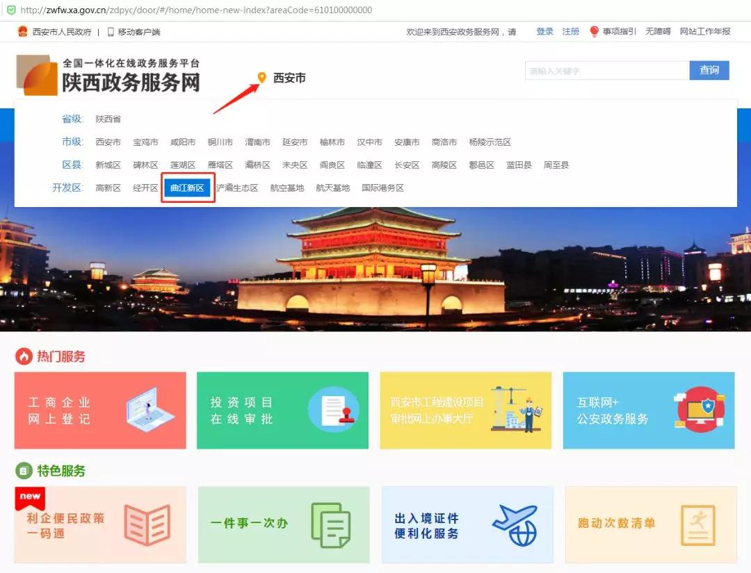 1.請(qǐng)您登錄“陜西政務(wù)服務(wù)網(wǎng)”官網(wǎng)(http://zwfw.xa.gov.cn/)首頁(yè),選擇進(jìn)入“西安市曲江新區(qū)”站點(diǎn)。