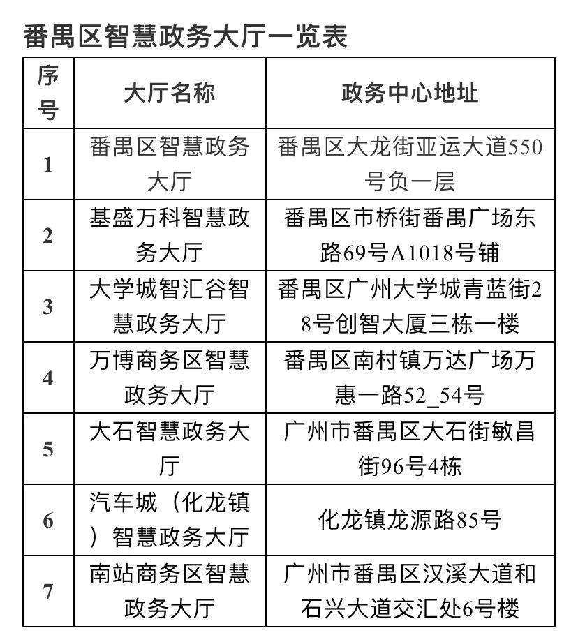 單位地址:廣州市番禺區(qū)南村鎮(zhèn)萬博商務(wù)區(qū)萬惠一路52-54號,番禺區(qū)政務(wù)服務(wù)中心萬博分中心業(yè)務(wù)受理窗口4號-7號
