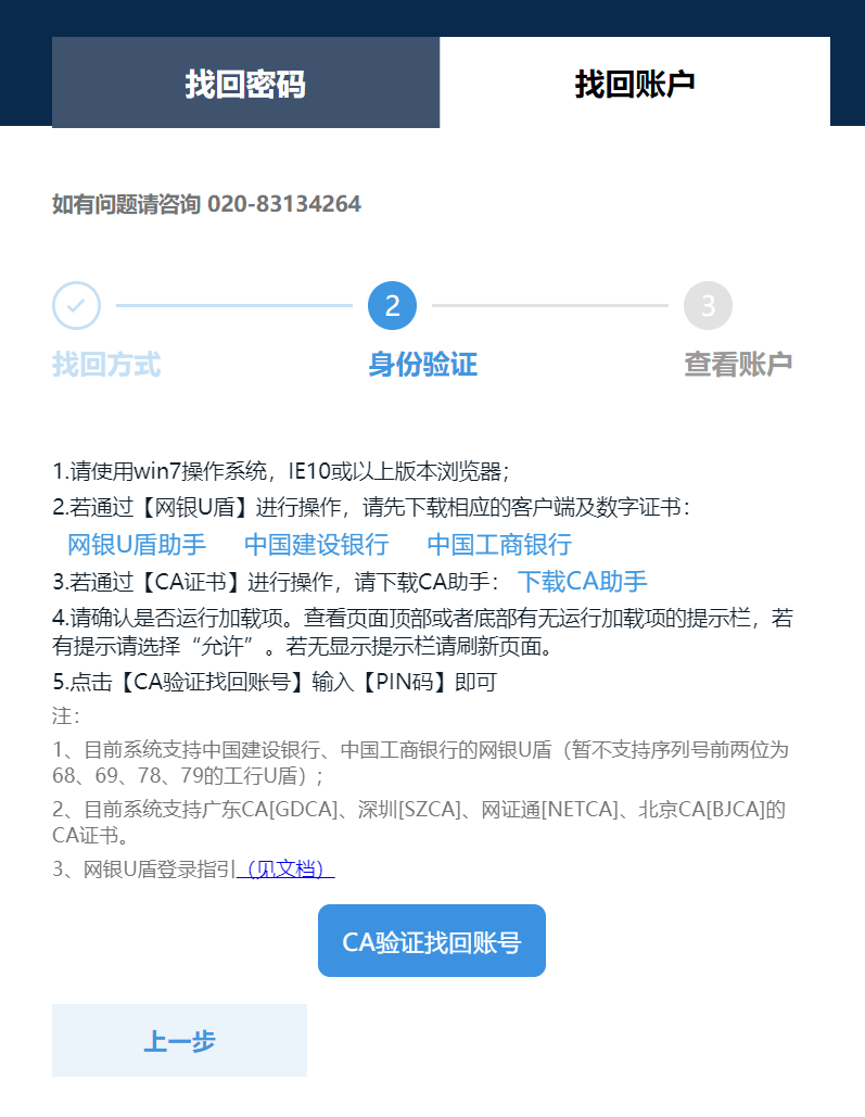 根據(jù)頁(yè)面提示下載CA助手,下載完成后,打開(kāi)CA助手,插入數(shù)字證書,點(diǎn)擊“數(shù)字證書驗(yàn)證找回賬號(hào)”,輸入PIN碼,點(diǎn)擊確定。