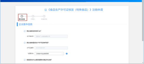 (2)申請注銷頁面如下,補(bǔ)全基本信息標(biāo)簽頁(注意:進(jìn)行注銷申請的主體須完成新辦申請過,否則不能進(jìn)行注銷申請),點擊下一步;