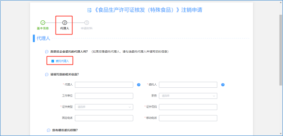 (3)“代理人”信息標(biāo)簽頁(根據(jù)需要選擇是否填寫),如需填寫勾選“委托代理人”,并填寫相應(yīng)信息;如不需填寫直接點擊下一步;