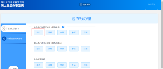 (1)食品生產(chǎn)許可證核發(fā)(特殊食品)新辦申請(qǐng)由“申請(qǐng)”頁(yè)面的“新辦”按鈕發(fā)起。