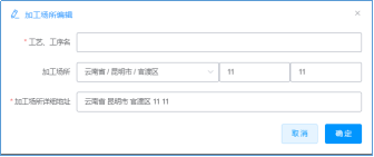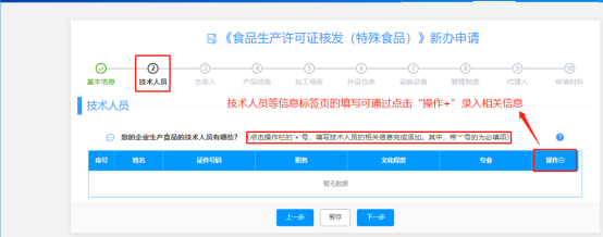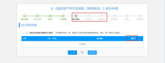 (6)“加工場(chǎng)所、外設(shè)倉(cāng)庫(kù)、設(shè)施設(shè)備”這三個(gè)信息標(biāo)簽頁(yè)的填寫(xiě)同“技術(shù)人員”信息標(biāo)簽頁(yè)填寫(xiě)一樣,都可通過(guò)點(diǎn)擊“操作+”跳出編輯小窗口,然后對(duì)相關(guān)信息進(jìn)行填寫(xiě),填寫(xiě)完后點(diǎn)擊下一步;