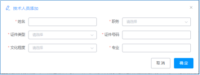 (3)“技術(shù)人員”信息標(biāo)簽頁(yè),可通過(guò)點(diǎn)擊“操作+”添加技術(shù)人員信息,并對(duì)技術(shù)人員信息進(jìn)行填寫(xiě),帶“*”號(hào)為必填項(xiàng)(其他須通過(guò)點(diǎn)擊“操作+”添加相關(guān)信息的標(biāo)簽頁(yè)都同“技術(shù)人員”的信息錄入一樣)。