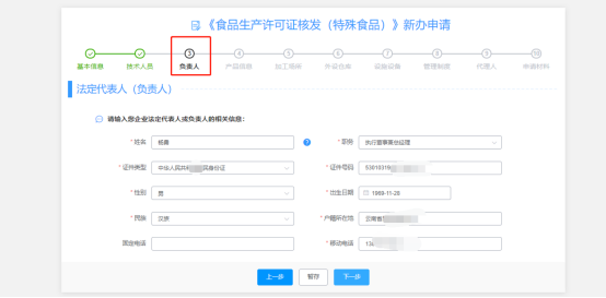 (4)“負(fù)責(zé)人”信息標(biāo)簽頁(yè),此標(biāo)簽頁(yè)信息一般隨登錄用戶(hù)同步過(guò)來(lái)(可補(bǔ)全或修改負(fù)責(zé)人信息),點(diǎn)擊下一步;