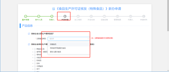 (5)“產(chǎn)品信息”標(biāo)簽頁(yè),選擇相應(yīng)的“主營(yíng)食品類(lèi)別”(特殊食品只有保健食品、特殊醫(yī)學(xué)用途配方食品、嬰幼兒配方食品三大主營(yíng)食品類(lèi)別,除特殊食品的主營(yíng)食品類(lèi)別除了這三項(xiàng)以外),選擇食品項(xiàng)目明細(xì),選擇完后點(diǎn)擊下一步;