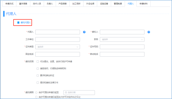 (8) “代理人”信息標(biāo)簽頁(yè)(根據(jù)需要選擇是否填寫(xiě)),如需填寫(xiě)勾選“委托代理人”,并填寫(xiě)相應(yīng)信息;如不需填寫(xiě)可直接點(diǎn)擊下一步;