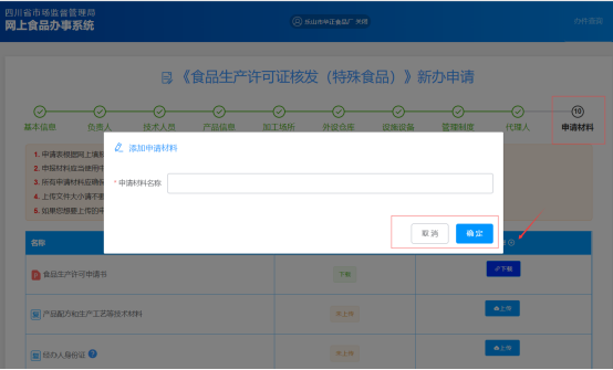 (9) “申請(qǐng)材料”信息標(biāo)簽頁(yè)為上傳申請(qǐng)?jiān)S可證需要的申請(qǐng)材料附件(同管理制度一樣,上傳附件格式為PDF),已經(jīng)列出的材料名稱(chēng)可進(jìn)行上傳,如果沒(méi)有列出的材料需要上傳的,需要點(diǎn)擊+進(jìn)行添加,上傳完成之后點(diǎn)擊提交并確認(rèn)提交;