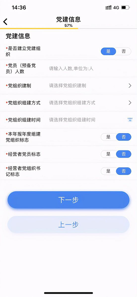 5、完善經(jīng)營(yíng)者信息、黨建信息。經(jīng)營(yíng)者信息可以直接通過(guò)“人員選擇”按鍵選擇經(jīng)辦人為經(jīng)營(yíng)者,或通過(guò)從圖片上傳身份證照片或掃描身份證原件等形式導(dǎo)入經(jīng)營(yíng)者信息,填寫(xiě)標(biāo)紅星空格處之后進(jìn)入下一步完善黨建信息。黨建信息默認(rèn)為否,可直接點(diǎn)擊進(jìn)入下一步,若需要錄入黨建信息,則選擇“是”,完善標(biāo)紅星空格后,點(diǎn)擊進(jìn)入下一步,如下圖:
