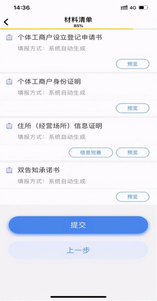 6、完善材料清單。若經(jīng)辦人與經(jīng)營(yíng)者為同一人(本人辦理的),則只需完善“住所(經(jīng)營(yíng)場(chǎng)所)信息證明”,點(diǎn)擊“信息完善”,通過(guò)下拉菜單選擇“房屋證明材料類型”、“房屋用途”,上傳照片后保存。若經(jīng)辦人與經(jīng)營(yíng)者不為同一人(委托代理人),除了完善“住所(經(jīng)營(yíng)場(chǎng)所)信息證明”,還需要完善“委托代理人證明”,點(diǎn)擊“信息完善”,根據(jù)提示填寫(xiě)標(biāo)紅星空格后保存。完成上述步驟后,點(diǎn)擊提交進(jìn)入簽名環(huán)節(jié),如下圖: