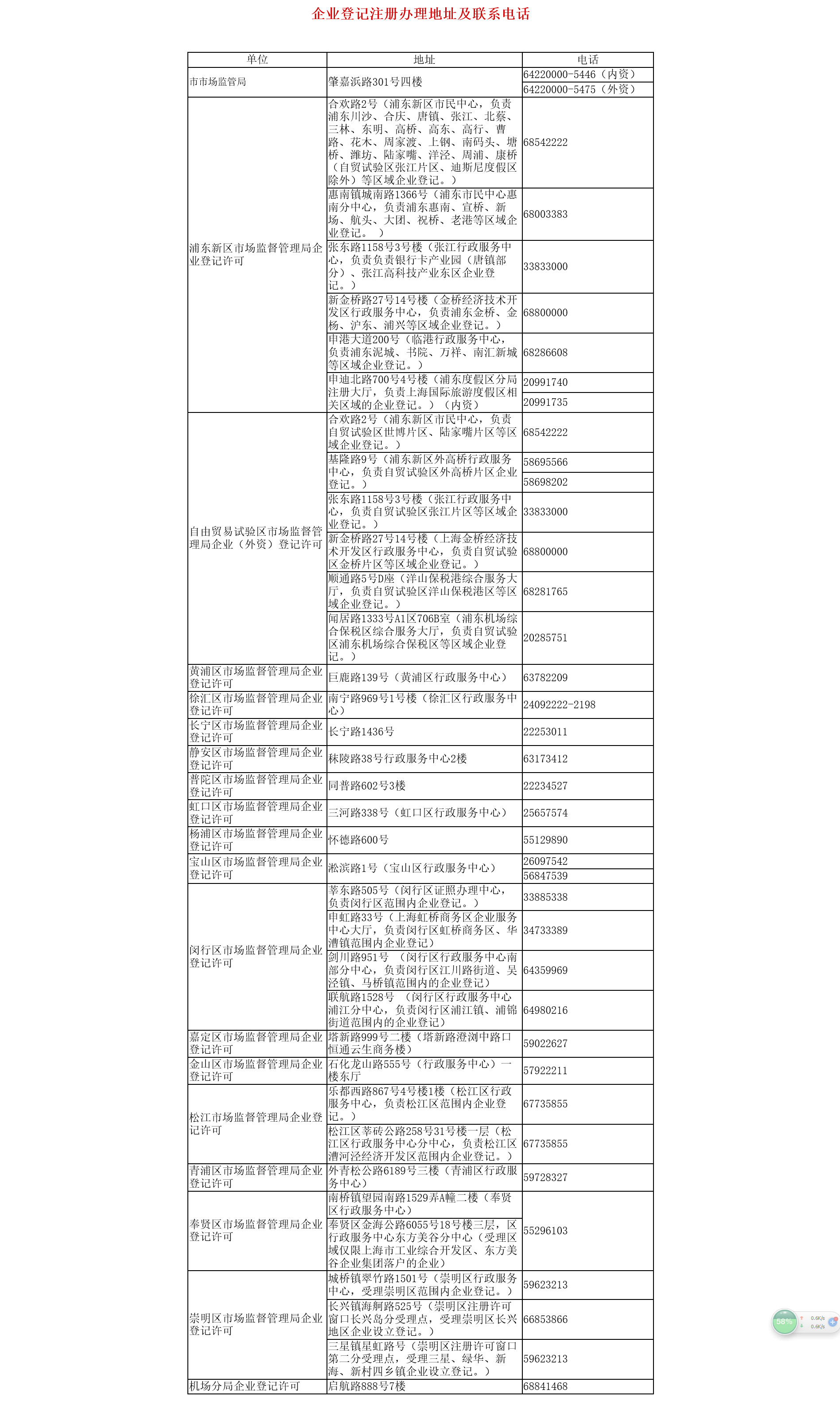 | 浦東新區(qū)市場(chǎng)監(jiān)督管理局(企業(yè)登記許可) | 合歡路2號(hào)(浦東新區(qū)市民中心,負(fù)責(zé)浦東川沙、合慶、唐鎮(zhèn)、張江、北蔡、三林、東明、高橋、高東、高行、曹路、花木、周家渡、上鋼、南碼頭、塘橋、濰坊、陸家嘴、洋涇、周浦、康橋(自貿(mào)試驗(yàn)區(qū)張江片區(qū)、迪斯尼度假區(qū)除外)等區(qū)域企業(yè)登記。) | 68542222 | 200032 |