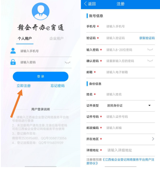 APP 登錄賬號(hào)和密碼跟江西省企業(yè)登記網(wǎng)絡(luò)服務(wù)平臺(tái)賬號(hào)密碼一致,如果沒有賬號(hào),可以點(diǎn)擊【立即注冊(cè)】注冊(cè)賬號(hào)。