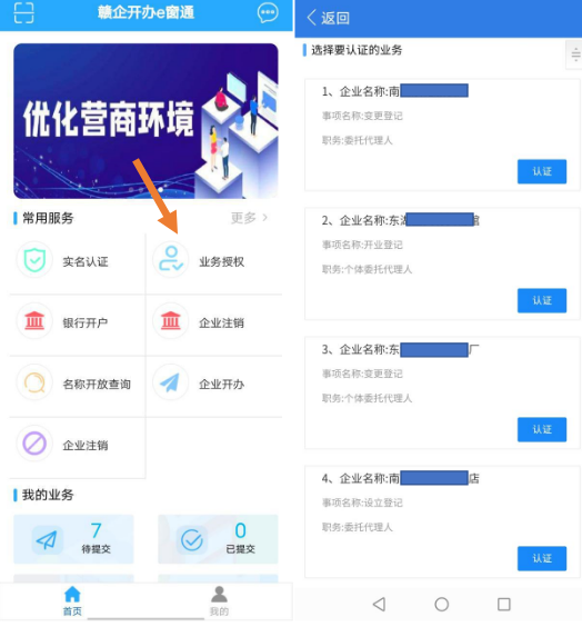 點(diǎn)擊APP 首頁點(diǎn)擊常用服務(wù)→業(yè)務(wù)授權(quán)模塊,進(jìn)行實(shí)名認(rèn)證。業(yè)務(wù)授權(quán)步驟:選擇企業(yè)→上傳證件→人臉識(shí)別→認(rèn)證完成
