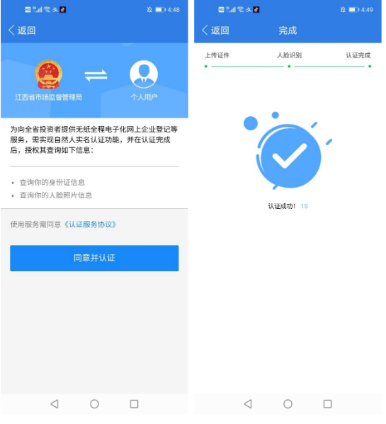 點(diǎn)擊同意并認(rèn)證進(jìn)行上傳證件和人臉識(shí)別通過后可以在江西省企業(yè)登記網(wǎng)絡(luò)服務(wù)平臺(tái)的辦理進(jìn)度中進(jìn)行文書打?。ㄋ凶匀蝗斯蓶|都需要進(jìn)行實(shí)名認(rèn)證)。