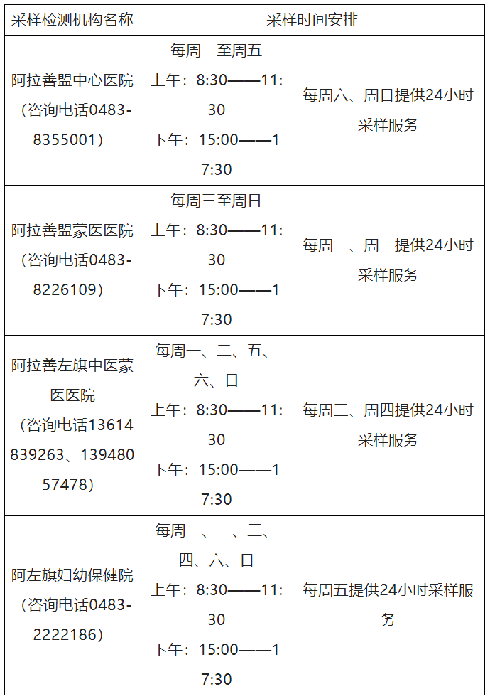 附:阿左旗巴彥浩特地區(qū)核酸采樣檢測機構(gòu)及時間安排