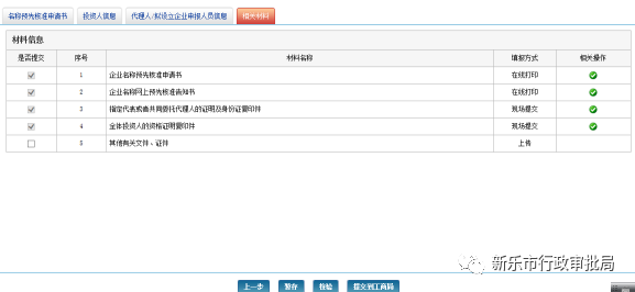 頁面下方有四個按鈕,可進(jìn)行信息上一步、暫存、校驗、提交工商局等四種操作。