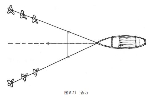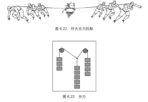 合力就是若干個(gè)不同方向的力合成一個(gè)力,所謂的場(chǎng)力通常就是合力 現(xiàn)象。例如,兩隊(duì)纖夫自河的兩岸拉船,各自方向的力形成一個(gè)向前的合 力(圖 6.21、圖 6.22)。