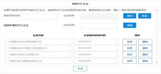 4) 顯示在選擇區(qū)域的付匯企業(yè)信息,點擊【選擇】按鈕,頁面將關(guān)閉,并將選擇結(jié)果(企業(yè)名稱、企業(yè)組織機構(gòu)代碼)顯示在付匯企業(yè)基本信息中。