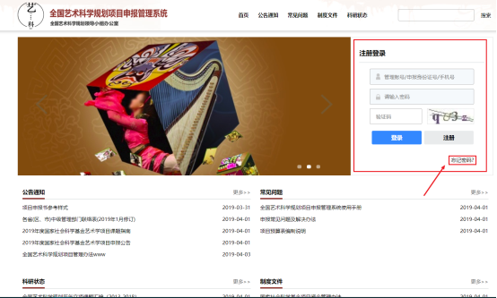 1)打開您安裝的瀏覽器,在瀏覽器地址欄輸入“申報管理系統(tǒng)”系統(tǒng)網(wǎng)址:http://yskx.mct.gov.cn,進(jìn)入系統(tǒng)首頁。找到注冊登錄界面右下方的“忘記密碼”鏈接(如圖2.2-1)。