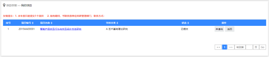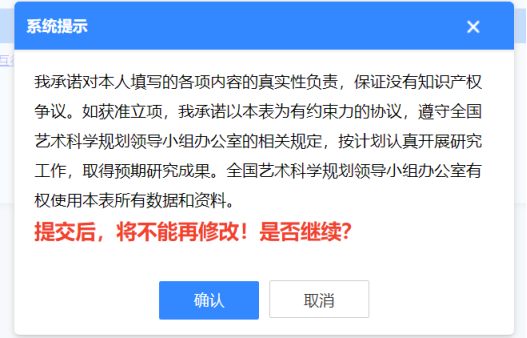 6) 閱讀并同意“項目提交申請承諾”后,點擊“確認”按鈕,系統(tǒng)會將項目提交到所屬單位進行審批。提交成功后,項目將不允許再進行修改。
