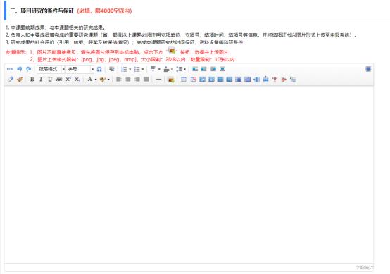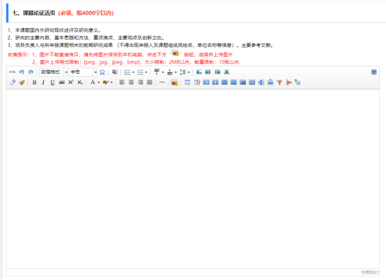 ? 為了能完整在A4紙上打印申報評審書內容,您上傳的圖片如果寬度超過595像素,系統(tǒng)自動將圖片壓縮成寬度不超過595像素的圖像副本然后上傳。同時,也請您在編輯申報評審書內容時,確保圖片寬度不要超過595像素,且不要將大圖片與文本排版在同一行。