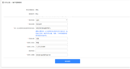 3)修改需要變更的單位信息,點(diǎn)擊“保存修改”按鈕,系統(tǒng)會(huì)將您所修改的單位資料信息保存到系統(tǒng)中。