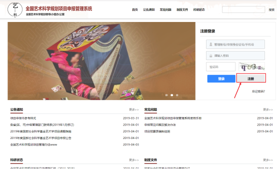 1)打開您安裝的瀏覽器,在瀏覽器地址欄輸入“申報(bào)管理系統(tǒng)”系統(tǒng)網(wǎng)址:http://yskx.mct.gov.cn,進(jìn)入系統(tǒng)頁面。找到“注冊(cè)登錄”右下邊的“注冊(cè)”按鈕(如圖3.2-1所示)。