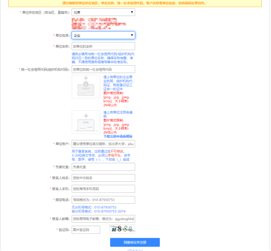 5)填寫完成后,點(diǎn)擊“同意協(xié)議并注冊(cè)”按鈕。系統(tǒng)會(huì)將您的注冊(cè)信息提交到上級(jí)單位進(jìn)行審批,并提示“注冊(cè)信息提交成功”提示框。