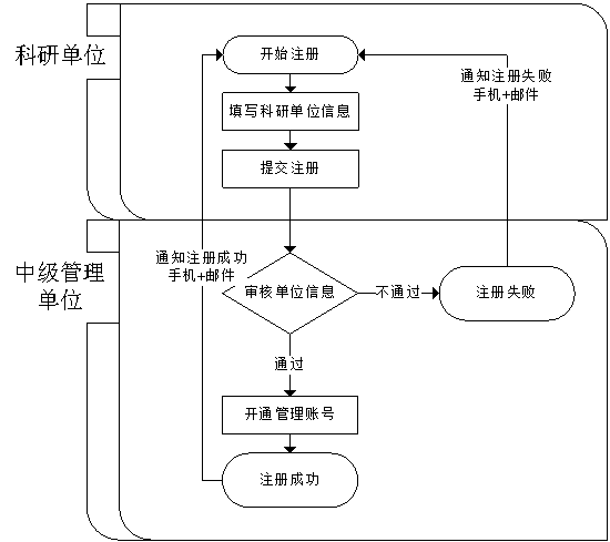此功能用于科研單位在線提交注冊(cè)資料,開通本單位的申報(bào)管理賬號(hào)。注冊(cè)流程為:1)科研單位在線提交注冊(cè)申請(qǐng);2)所屬中級(jí)管理單位審核注冊(cè)資料開通賬號(hào);完成業(yè)務(wù)流程圖,如下圖所示: