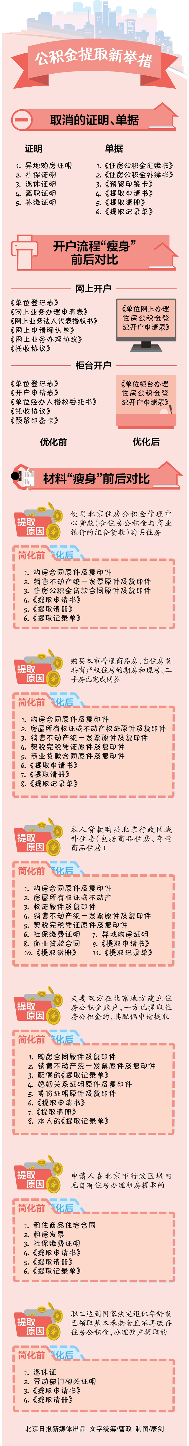 通知》由四個(gè)部分組成,明確了提取住房公積金的辦理流程和繳存程序,同時(shí)對(duì)內(nèi)部管理和違規(guī)違法處理等情況做了規(guī)定?!锻ㄖ啡∠艘酝k理過(guò)程中需提交的異地購(gòu)房證明、社保證明、退休證明、離職證明和補(bǔ)繳證明,取消了以前需要填寫的《住房公積金匯繳書》、《住房公積金補(bǔ)繳書》等單據(jù)。北京住房公積金管理中心副主任蔣然表示,有19種情況提取材料進(jìn)行了大幅度簡(jiǎn)化,其中有13種材料只需要持本人身份證填寫相對(duì)應(yīng)的表格即可辦結(jié),還有6種情況只需要提供身份證或者一種材料。與此同時(shí),《通知》首次通過(guò)“授權(quán)+承諾”的形式,由申請(qǐng)人簽訂誠(chéng)信承諾條款,告知申請(qǐng)人承擔(dān)虛假承諾將記入個(gè)人不良信息庫(kù)和有關(guān)征信系統(tǒng)的責(zé)任。新辦法將于2017年9月1日起施行。按照《通知》,繳存人如果沒有買房,而是租房子住的,提取公積金的流程也進(jìn)行了簡(jiǎn)化,方便使用。