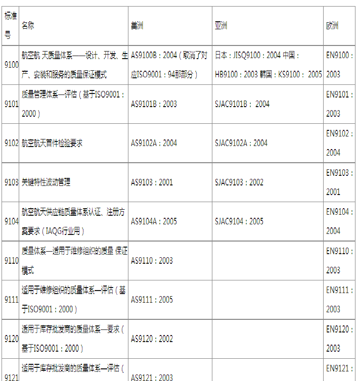 Aerospace(航空AS9100即)。ISO9000為基礎,增加了行業(yè)的特殊要求,專門制定的質量保證模式。 航空基礎質量體系標準1997年,是國際航天產業(yè)與組織共同努力的一項重要成果,。。。