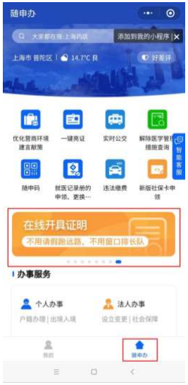 3.進(jìn)入“隨申辦”小程序,在“隨申辦”欄目中點(diǎn)選“在線開(kāi) 具證明”;