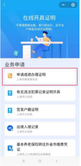 4.在“在線開(kāi)具證明”欄目下,點(diǎn)選“申請(qǐng)成績(jī)辦理證明”;
