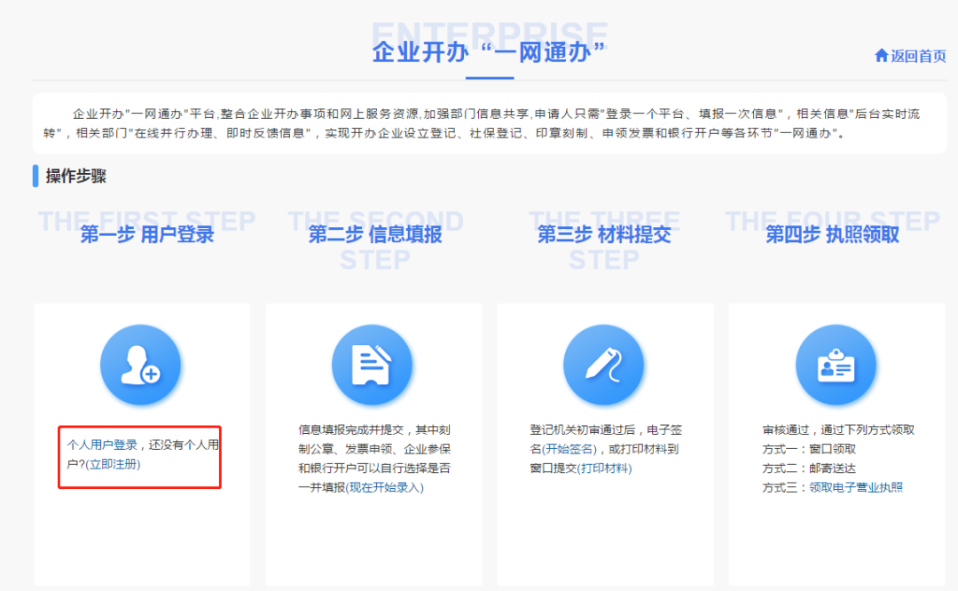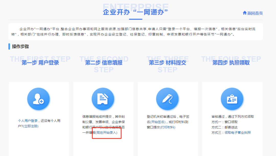 注冊登錄后,返回【企業(yè)開辦“一網(wǎng)通辦”】模塊,點擊該模塊中信息填報下的“現(xiàn)在開始錄入”。