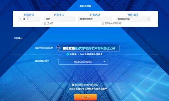 根據(jù)提示填寫(xiě)企業(yè)名稱(chēng)的“四段式”內(nèi)容,系統(tǒng)會(huì)進(jìn)行自動(dòng)比對(duì),顯示已有的相似企業(yè)名稱(chēng)供申請(qǐng)人參考,申請(qǐng)人確定擬申請(qǐng)名稱(chēng),選擇登記機(jī)關(guān),勾選“我已閱讀《名稱(chēng)申報(bào)須知》”,提交名稱(chēng)申請(qǐng),系統(tǒng)會(huì)再次進(jìn)行名稱(chēng)查重,查重通過(guò)后方可進(jìn)行下一步。申報(bào)通過(guò)不代表登記機(jī)關(guān)對(duì)于企業(yè)名稱(chēng)的確認(rèn),具體以審核意見(jiàn)為準(zhǔn)。