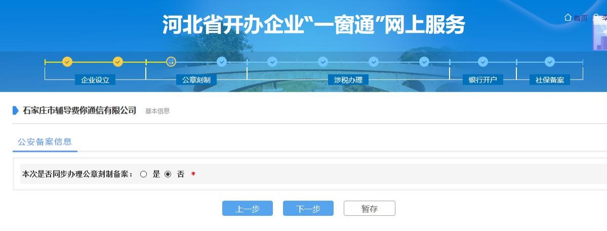 選否,不同步辦理刻章備案,待領(lǐng)取營(yíng)業(yè)執(zhí)照后按照傳統(tǒng)方式去刻章網(wǎng)點(diǎn)刻章。