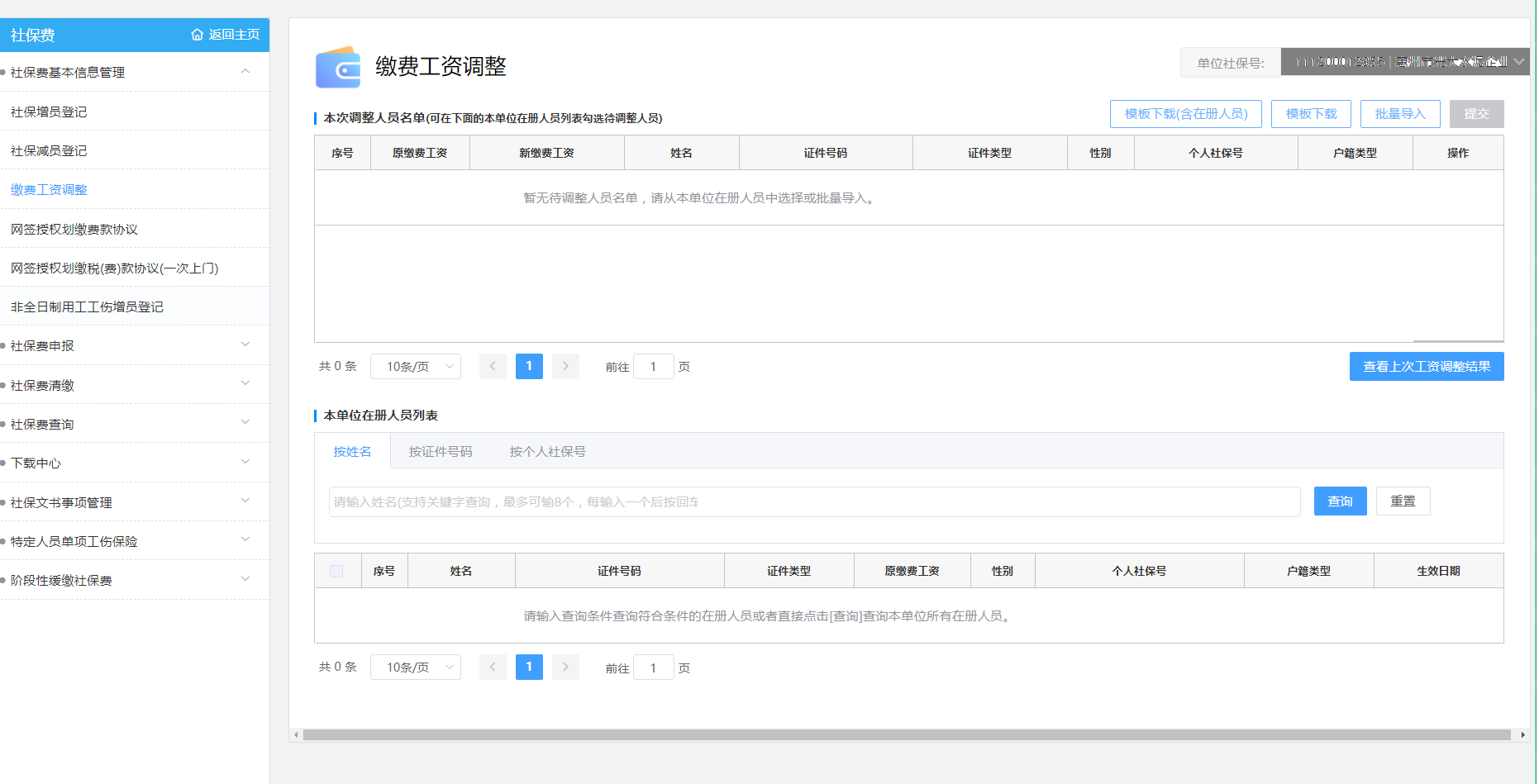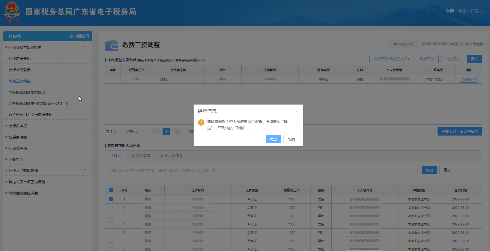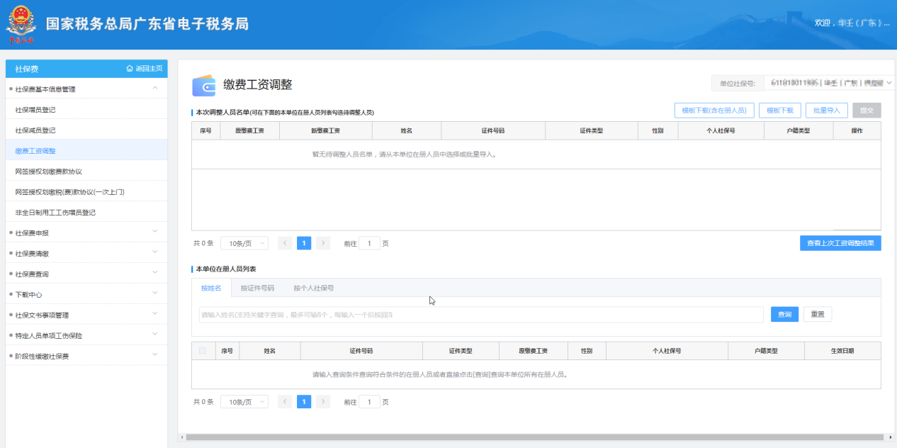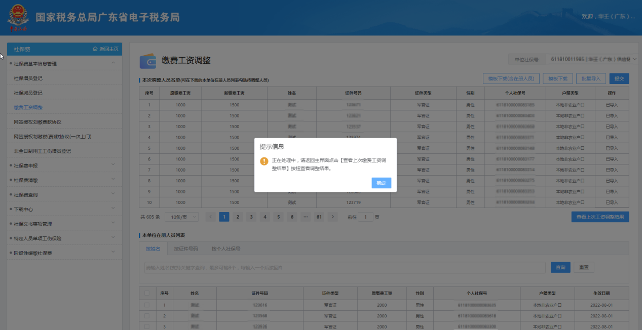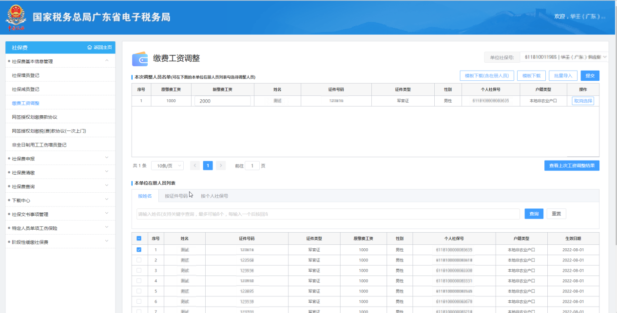 【本次調(diào)整人員名單】:顯示手工勾選或批量導入的待調(diào)整繳費工資人員;