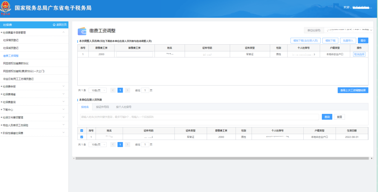 【提交】:提交【本次調(diào)整人員名單】下的所有調(diào)整繳費工資人員信息;